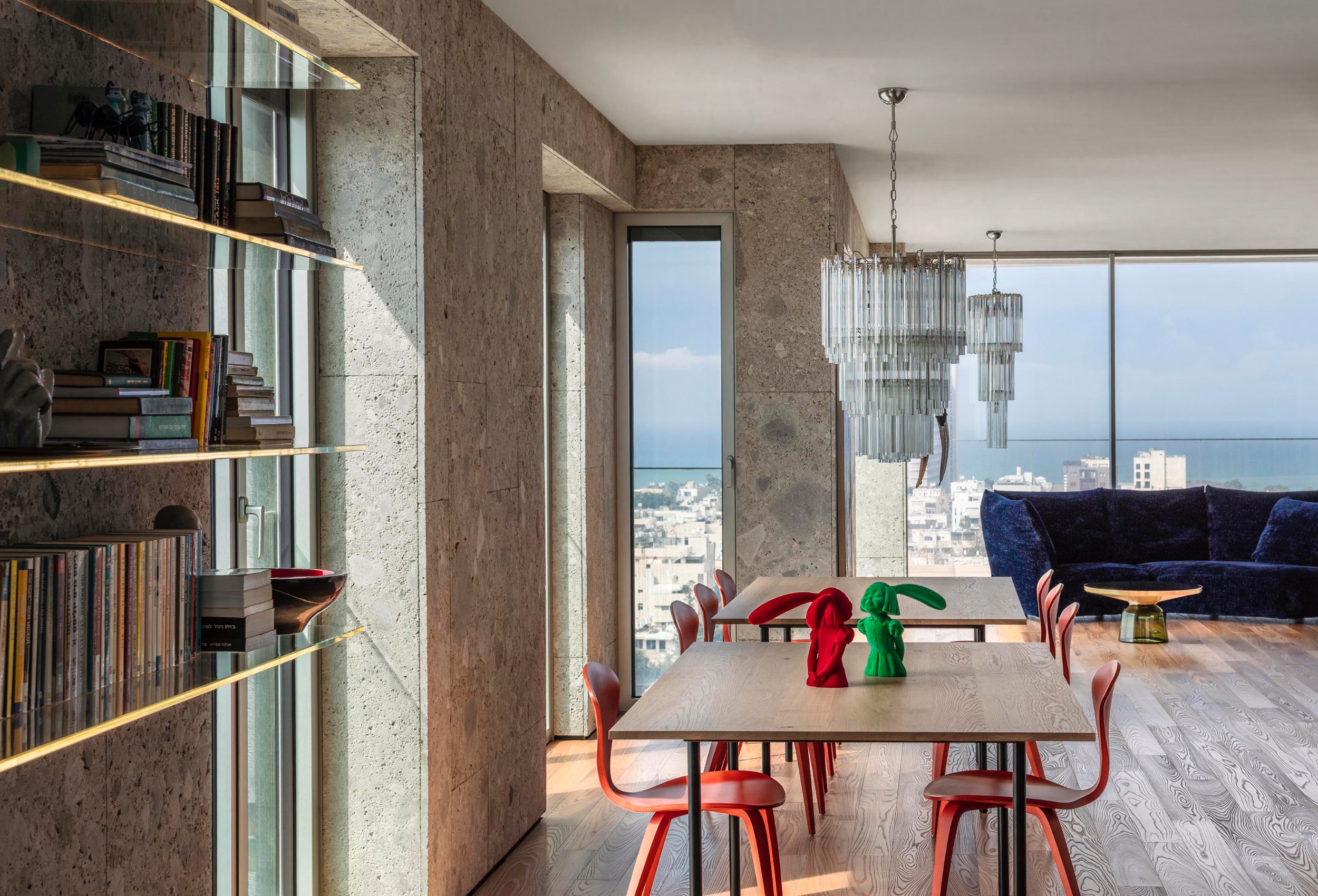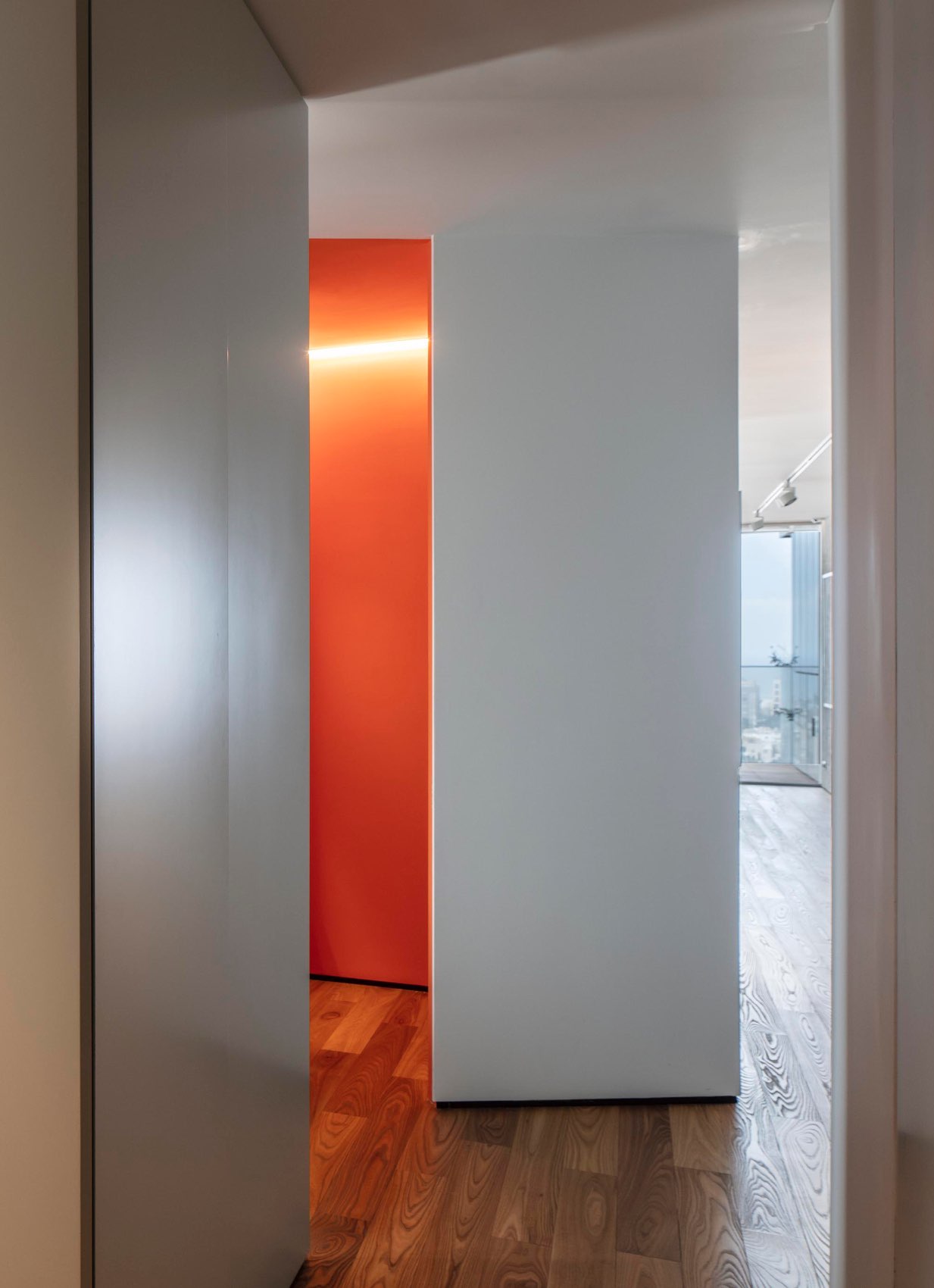 In this apartment located on the twelfth floor of a new tower in the heart of Tel Aviv, we kept the original shell unchanged. The space is completely open of this place from East to West, so the inhabitants can enjoy a wide view of the interior and of the surrounding city.