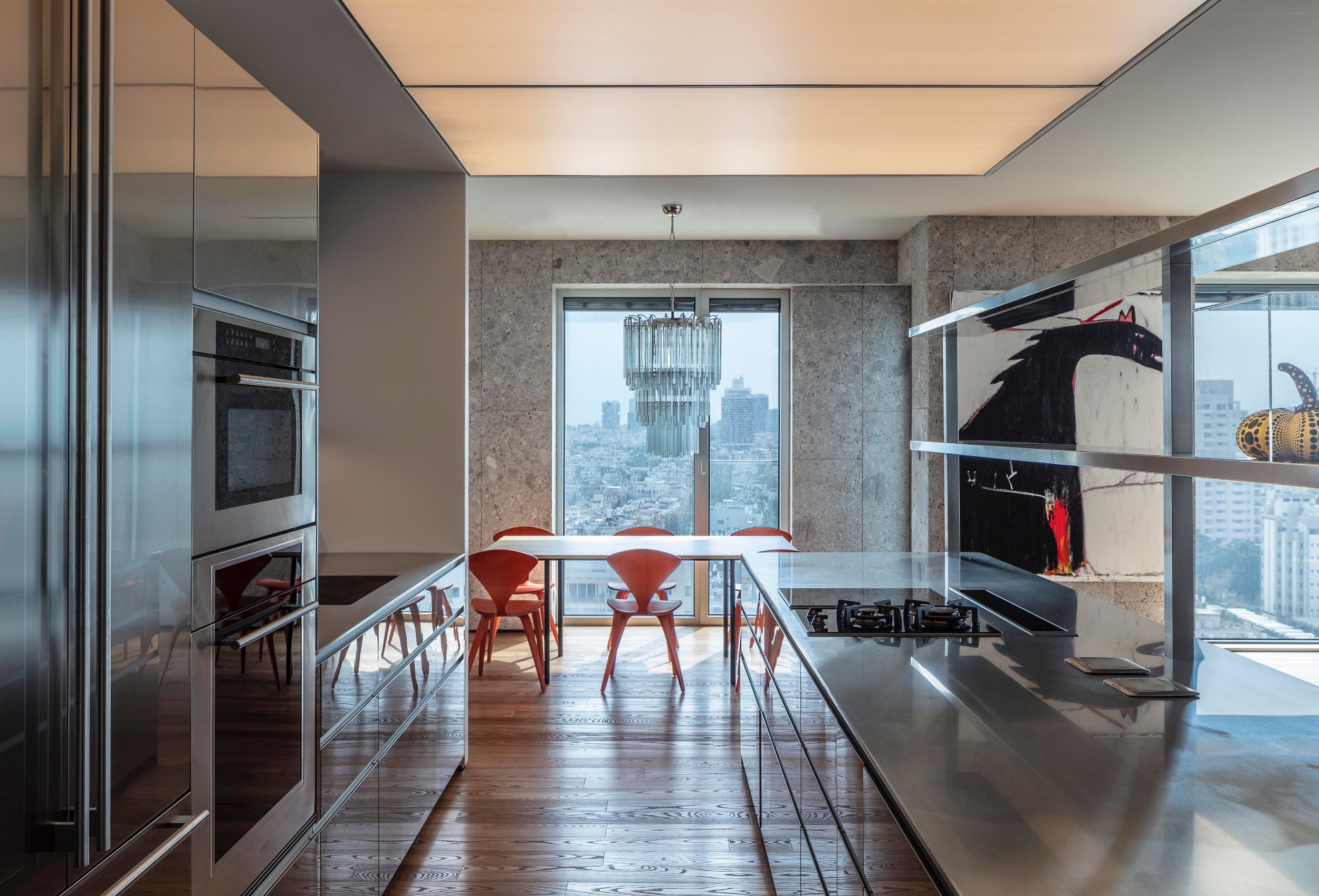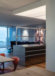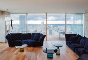 In this apartment located on the twelfth floor of a new tower in the heart of Tel Aviv, we kept the original shell unchanged. We made the space of this place from East to West is completely open, so the inhabitants can enjoy a wide view of the interior and of the surrounding city.