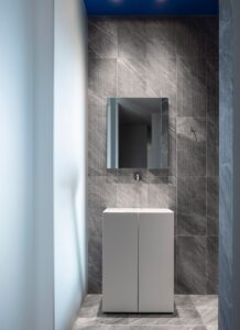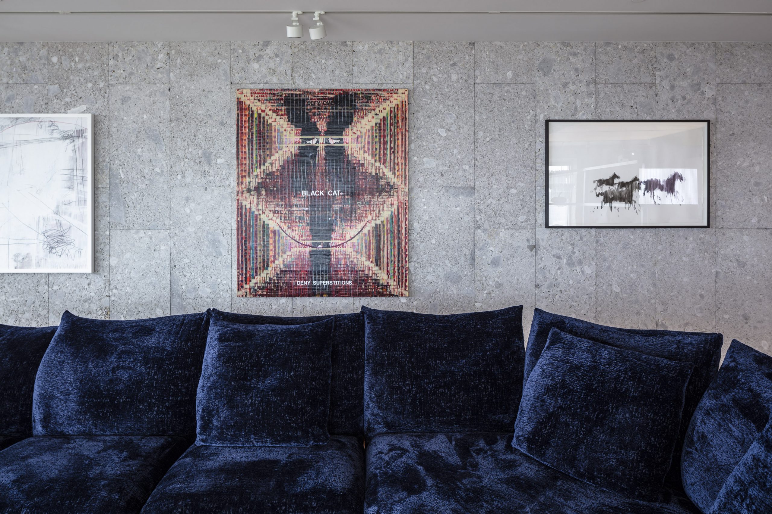 The material emphasis was given on purpose only on the single wall of the apartment, by covering it in stone. We chose a rough ceppo di Gré stone, which gives the whole space a structural vibration. The infinite spots trigger a pictorial visual effect, they are a basis for the exhibited artworks, as an additional creation.