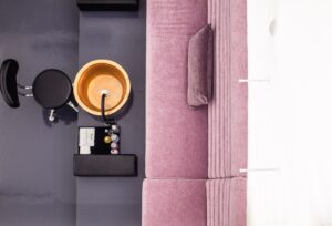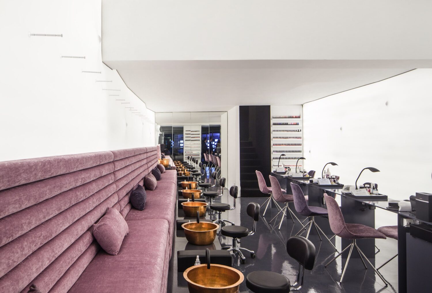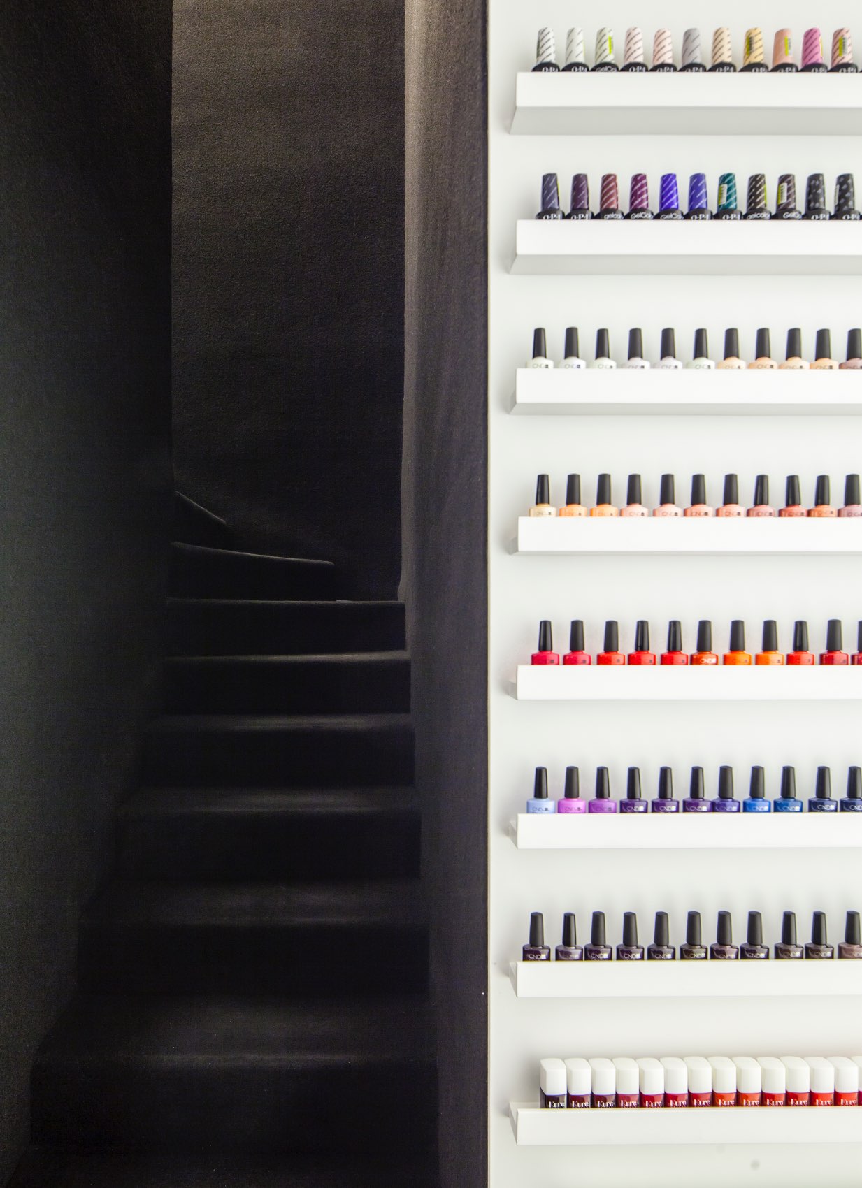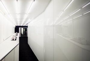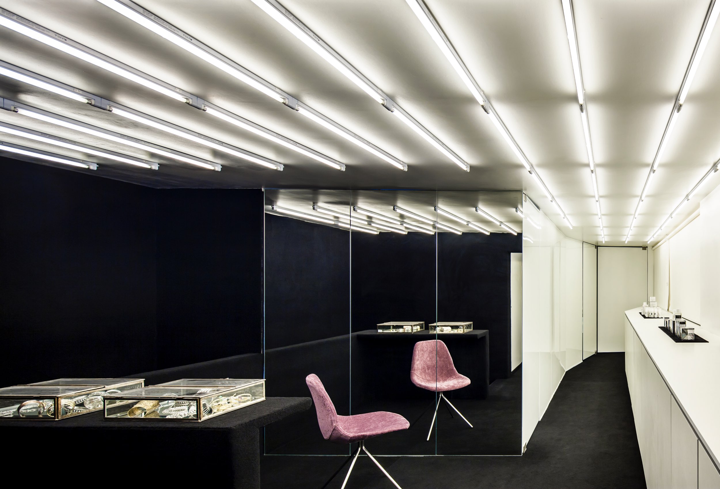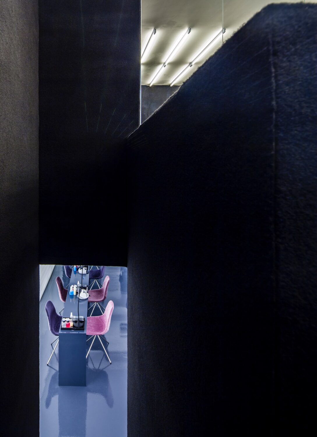 A thick black carpet covers the stairs and the walls of the second floor. The basic idea of this part of the clinic is to recreate all over the floor a sense of softness and a hushed atmosphere. This level is further extended by the glass wall of the treatment rooms, by the vis-à-vis mirrors, and a large number of fluorescent neon lights on the ceiling. These elements create the feeling of being in a wider space.