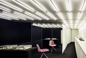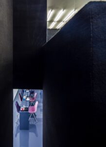 The contrast it’s between, the permanent white back-light walls in the entrance and the primordial darkness of black, in the second floor.