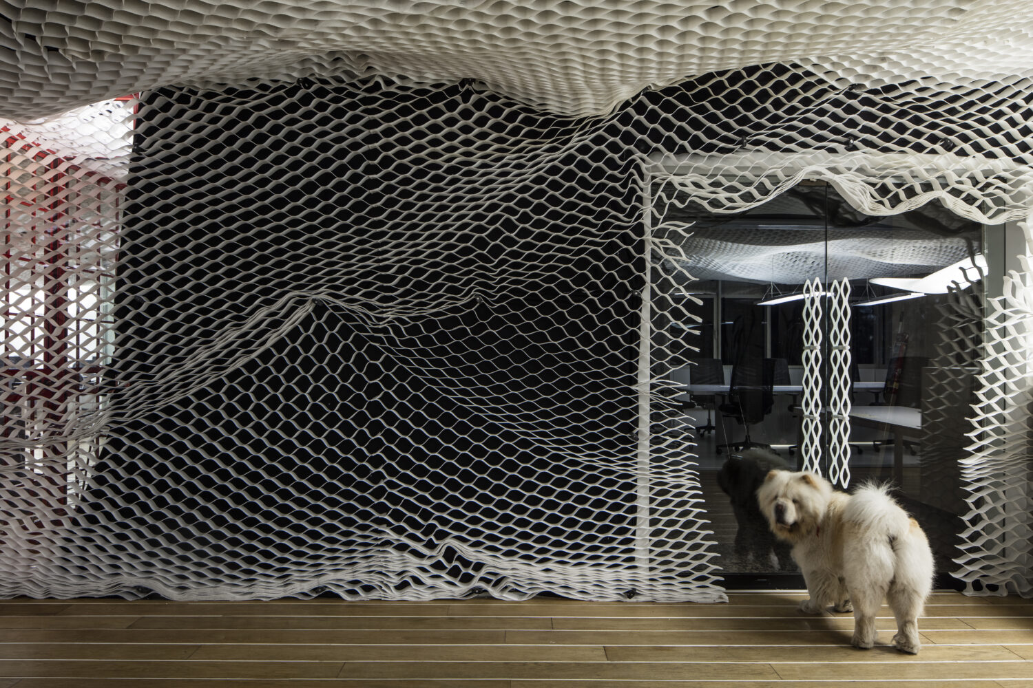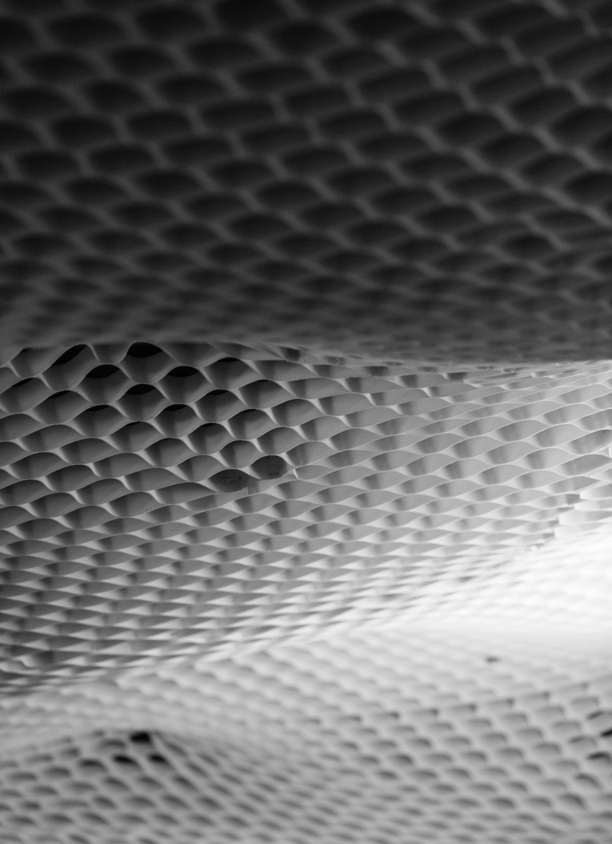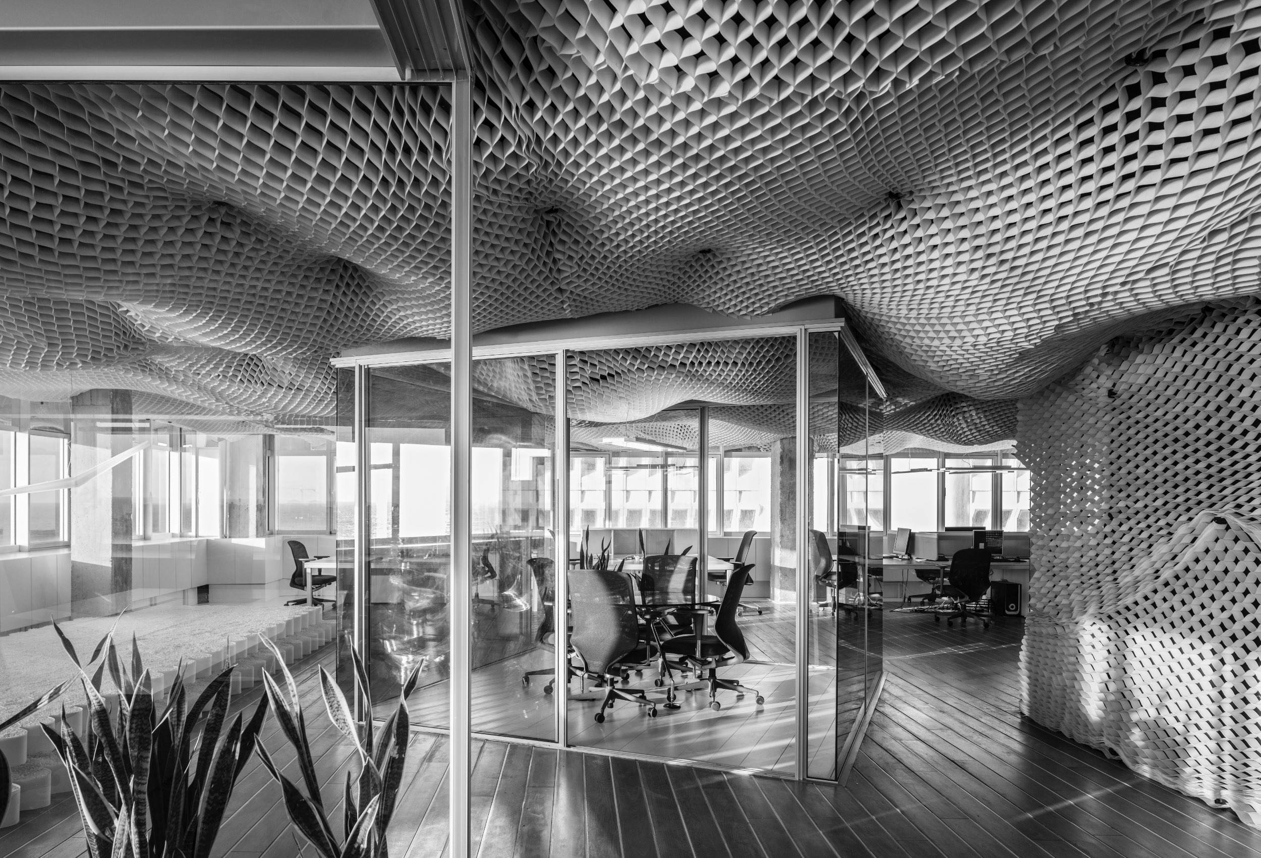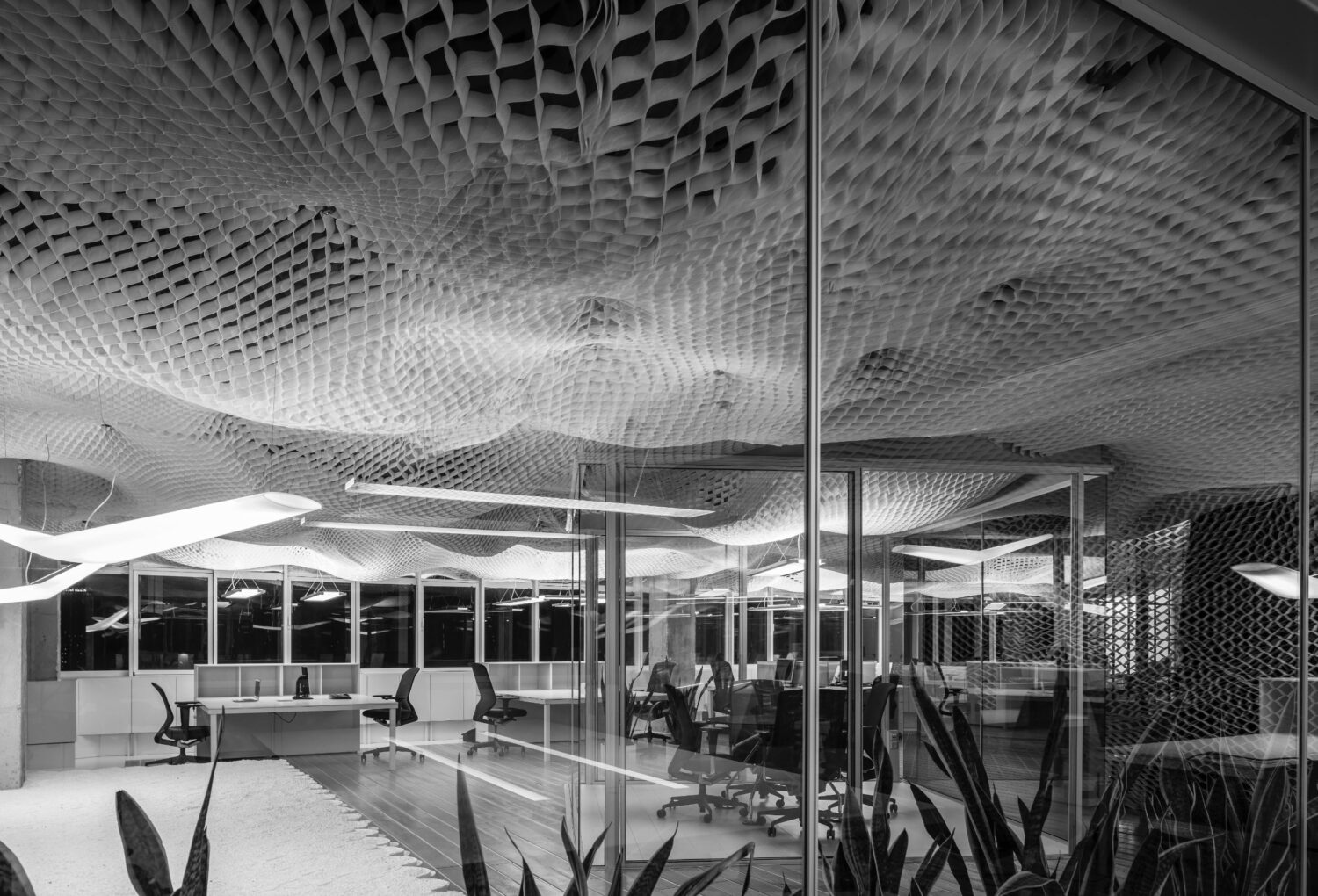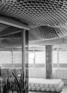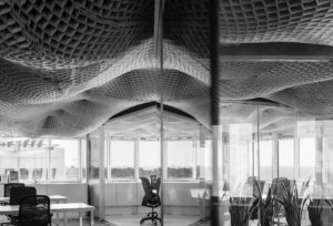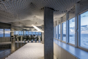 Contrary to the previous project we realized for PRS, in this floor the area dedicated to offices is completely open. We built a ceiling-membrane-sky, modeled with the geo-cell net, capable both to adapt to the acoustic needs and to fit as technical support for the plant. In this way, it became a unique expressive object, in continuity and dialogue with the sea waves.