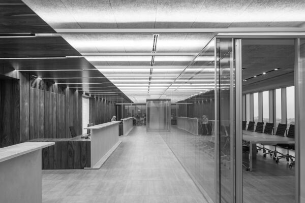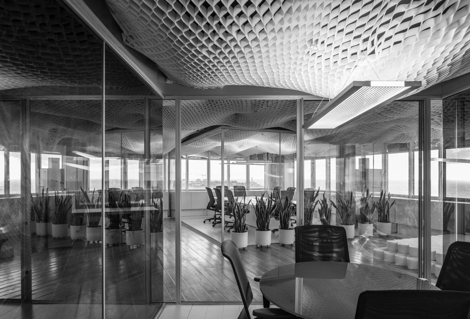 In the middle of the space, the first meeting room rotated 28 degrees compared to the façade and composed of transparent panels, made of partially reflecting glass, creates a continuity with the sea view. The main meeting room is enclosed between transparent panels and faces the promontory of Jaffa and the promenade along the sea of Tel Aviv.