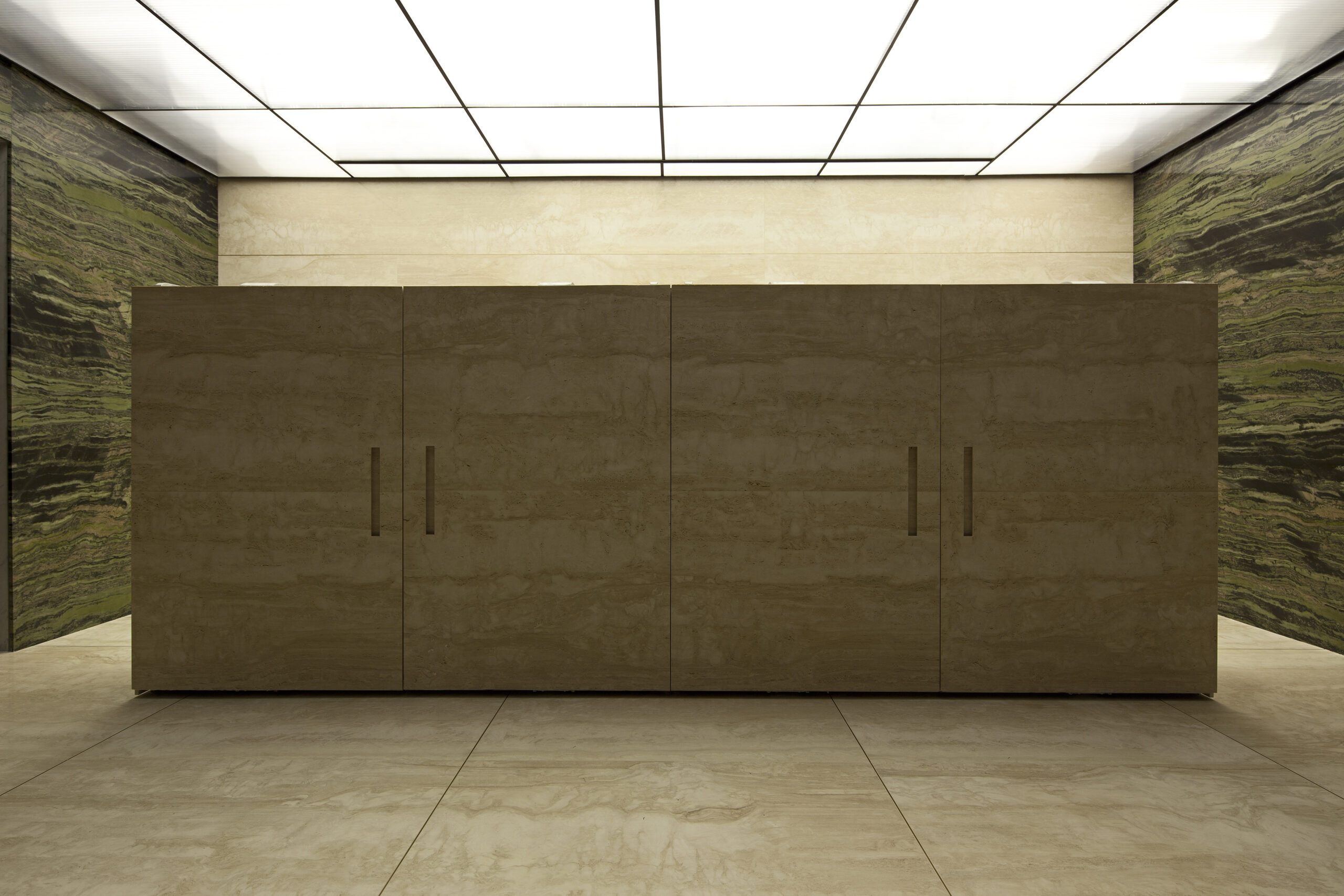 In the third room the pureness of the osso travertine is exhibited by placing 175 cm wide panels in the central area, while in the peripheral areas the same panels are used for two different motifs. The panels on the left are 250 cm wide, marked by subtle brass rods that proceed from the floor upwards on to the walls. On the right-hand wall, panels of 132×104 cm are marked by 5 cm wide strips of oxidized travertine. This motif moves unsteadily towards the stone wall, while the remaining walls are unexpectedly matched with the exuberant verde bamboo. The room is illuminated by a backlit polycarbonate ceiling, a fragment of a winter garden.