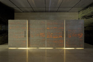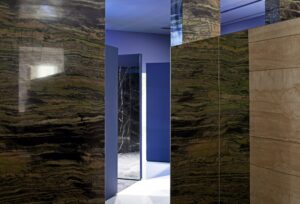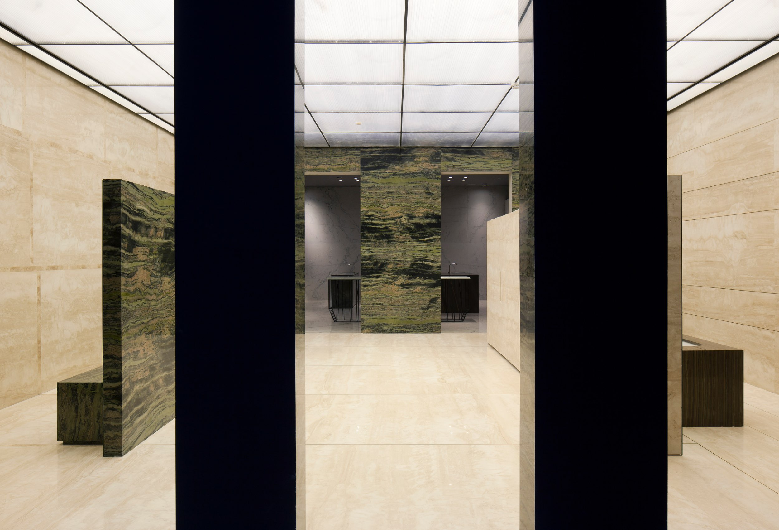 The gallery is an exposition space across two levels, adjacent to the stone workshop laboratory, where blocks of marble, travertine, stone and granite from all over the world are stored. The visual connection between these untouched blocks of natural material, already complete in their inherent beauty, is generated via a pathway of dark wall covered with rough grey-black granite, carved and eroded by thin cuts where water runs. The drops falling onto the stone produce an intermittent sound, depicting the most faithful narrative of the stone’s formation.