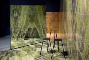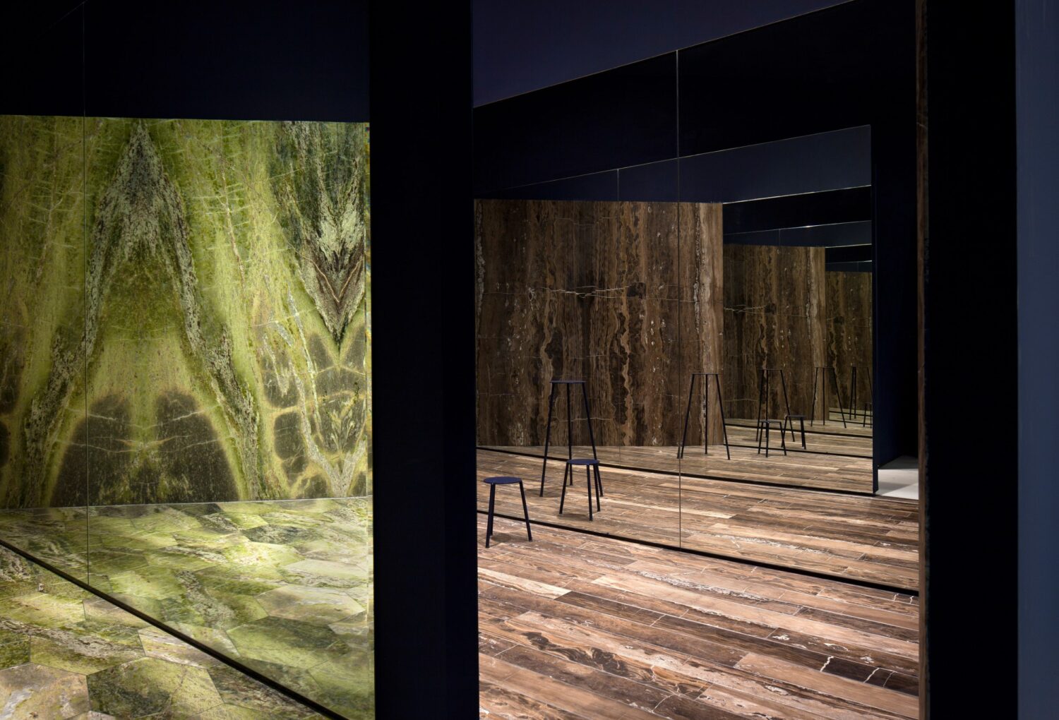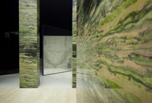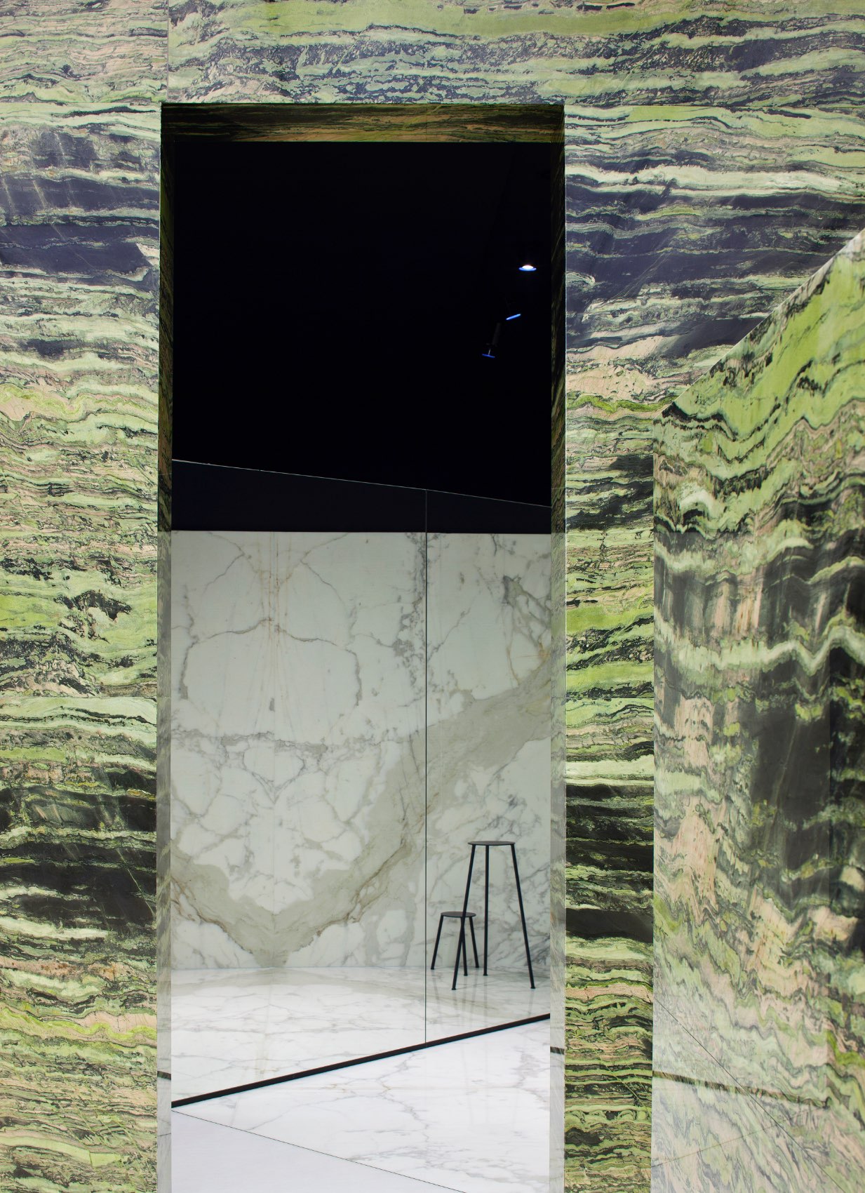 On the ground floor a central corridor crosses the gallery, marked by thresholds that separate the four exposition spaces. The idea is that of being suspended between two contradicting material conditions: evidence and surprise. The first room is sandwiched between two facing walls of overlapping sivec marble slats, one horizontal and the other vertical, both inclined upwards. This appears as a wall composed of various shades of black granite. Composed of different types of finishing, wrinkled-flamed and smooth-shiny, the black-on-black effect magnifies the tactile quality of the materials. In the second room the metamorphosis of the rock surface is told by the various types of stone demonstrated as functional blocks, in elegant-brown and aqua-stone. The meaning attributed to the materials is awarded by their color, by the precision of the structure and the carving shaped like the pages of a book. The blocks are suspended above the polished calacatta marble flooring, while the rough walls, covered with the same calacatta marble, assume the aspect of a cloudy fabric.