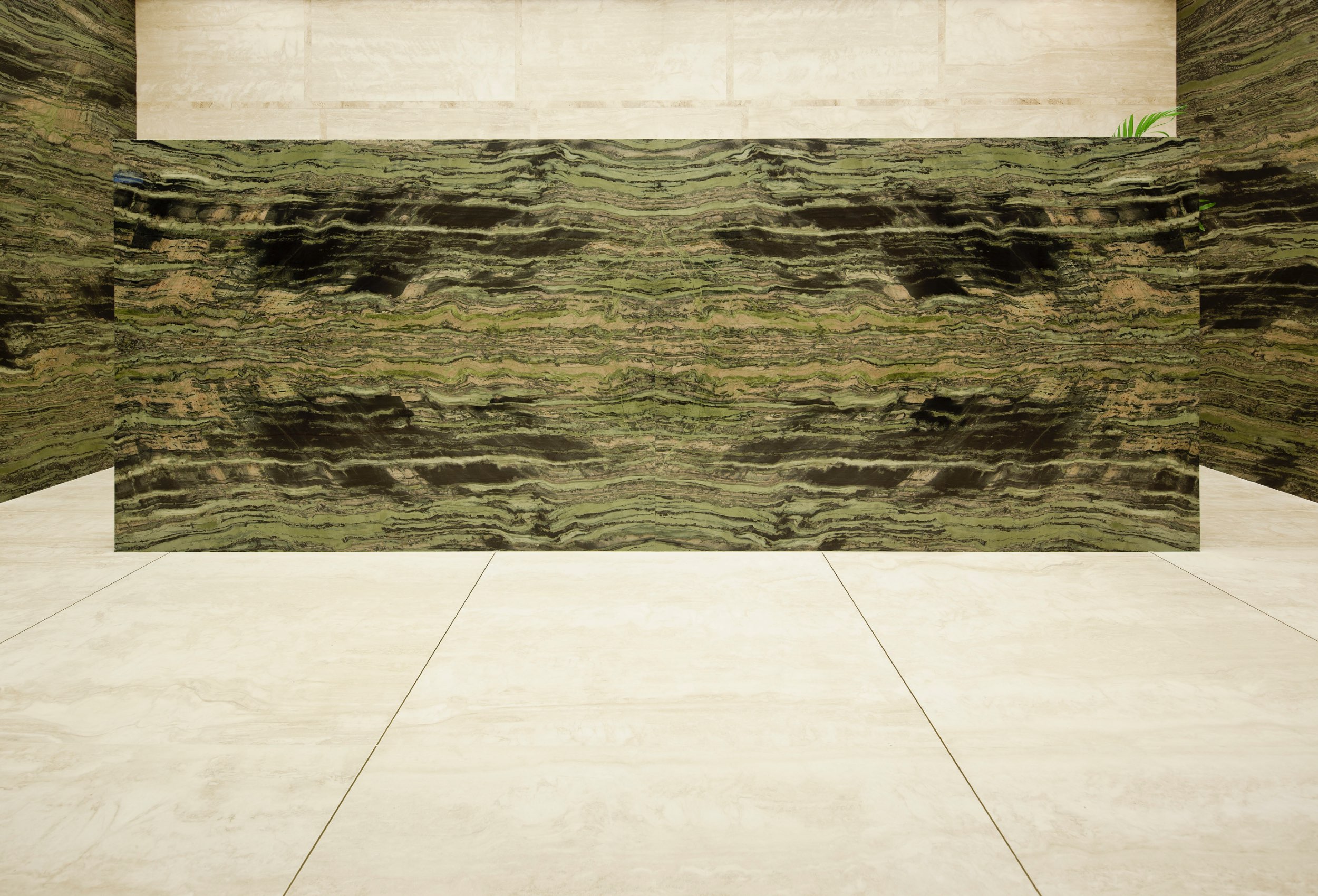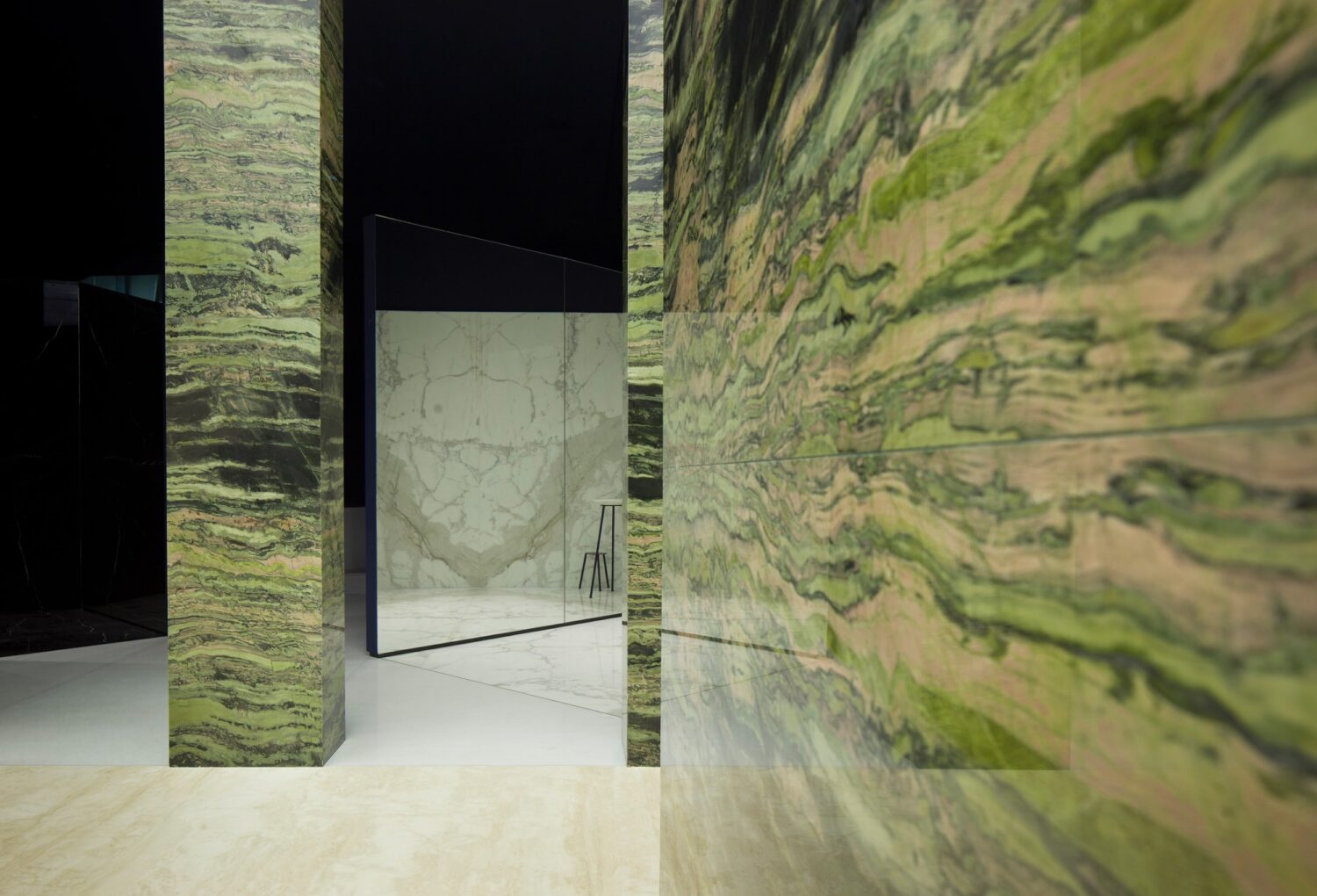 In the main entrance, the staircase that leads to the first floor is covered with a panel of fusion fire granite, composed and placed so that its veins match the direction of the path. At the top of stairs, on the first floor where the precious stone slabs are located, the facing wall is composed of irregular slabs of lasa stone, placed vertically and overlapping to create a delicate, translucent textile. When exposed to different intensities and sources of light, the slender layers of material are distinguishable, the stone becoming a faint partition between the office area and the visitor route.